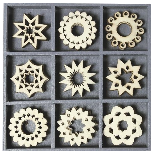 Drewniane pudełeczko z 45 elementami drewnianymi - 9 wzorów po 5 sztuk, w rozmiarze 2,7-3 cm. Pojedyncze elementy można przyklejać klejem lub taśmą dwustronną do różnych powierzchni np. papieru, drewna.