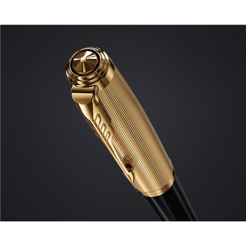 • Korpus pokryty trwałą, drogocenną żywicą o błyszczącej powierzchni, pierścienie i nasadka wykończona cyzelowanym złotem, rozpoznawalny klip marki PARKER.
