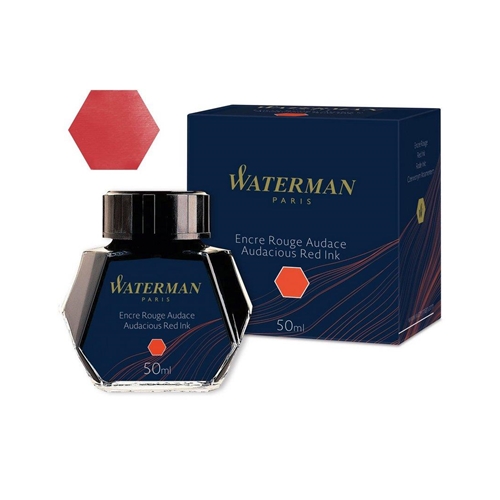 Wysokiej jakości czerwony atrament w szklanym opakowaniu o pojemności 50 ml, zapakowany w kartonowe pudełko.